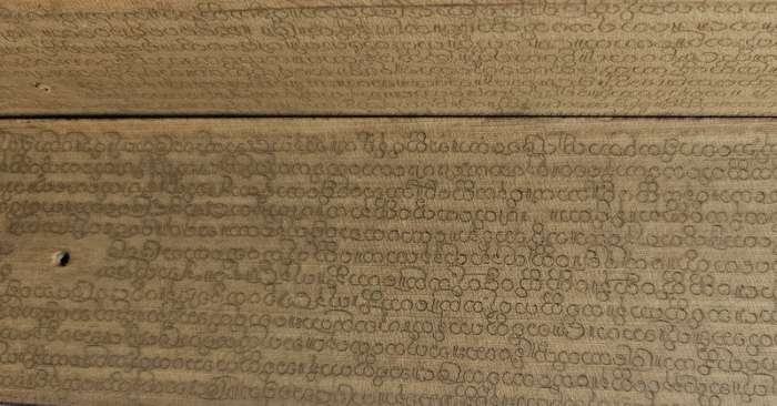 The purpose of the wooden outer covers is both practical and ritual: they shield the fragile palm leaves from humidity and insects while signifying the sacred status of the text.