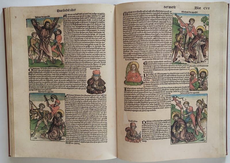 - Massive Illustration Program: The book contained an unprecedented number of woodcut illustrations (about 645 original blocks were used to create 1,809 images by repetition and variation). These were created by Michael Wolgemut and Wilhelm Pleydenwurff, whose workshop famously employed a young Albrecht Dürer.